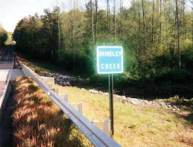 Sign at Brindley Creek where it runs under County Road 747 in Simcoe, Alabama.